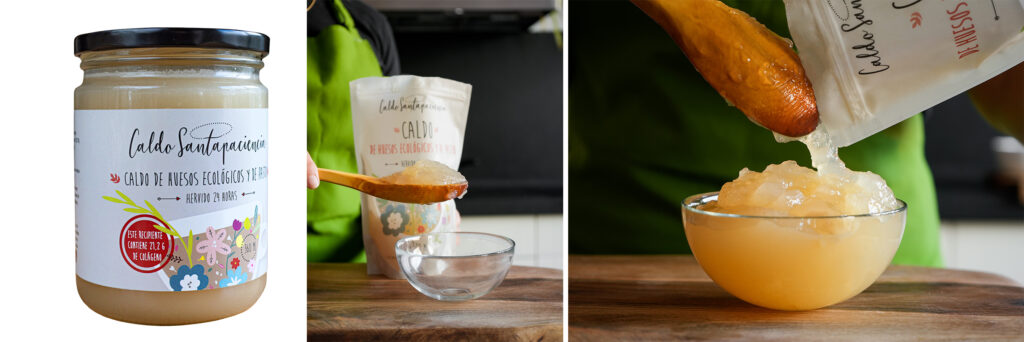 -Nuestro caldo tiene un sabor profundo y redondo, con matices que recuerdan a lo casero y al fuego lento. La textura es ligeramente untuosa, gracias al colágeno natural, y deja una sensación reconfortante en boca. El aroma es intenso pero equilibrado y a la vez muy neutro y suave. Visualmente, presenta un tono ámbar dorado, resultado de la cocción larga y la pureza de los ingredientes.